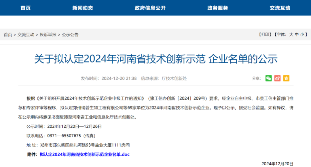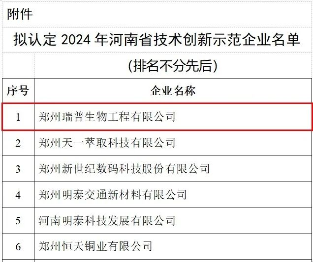 近日,河南省工信厅公示了拟认定2024年河南省技术创新示范企业名单,郑州瑞普生物工程有限公司荣登榜单。“技术创新示范企业”是为鼓励工业企业开展技术创新,增强企业核心竞争力,加快转变经济发展方式,促进和完善以企业为主体、市场为导向、产学研相结合的技术创新体系的建设,是工信厅和财政厅联合认定的科技创新综合水平较高的荣誉。