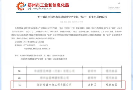 近日,郑州市工业和信息化局发布《关于拟认定郑州市先进制造业产业链“链主”企业名单的公示》,郑州瑞普成功入选郑州市先进制造业产业链“链主”企业名单。